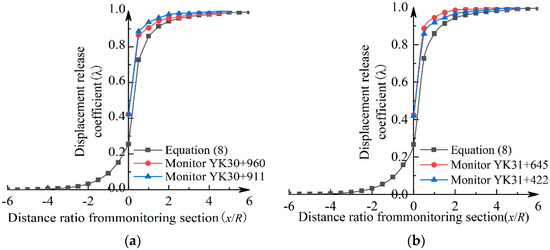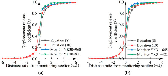 The displacement release coefficients of the two equations at the tunnel face are 0.25 and 0.29, respectively. It is only suitable for section x ≥ 0, which is contrary to the actual project.