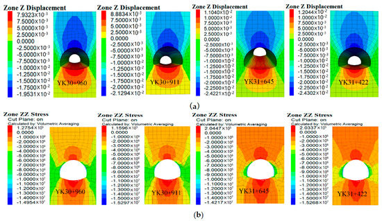 Nephogram of displacement and stress changes of different monitoring sections: (a) displacement nephogram; (b) stress nephogram.