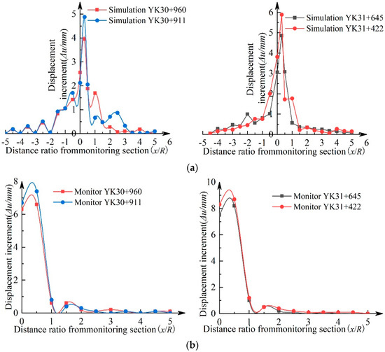 Displacement increment curve of different sections: (a) numerical simulation displacement increment change curve; (b) field monitoring displacement increment change curve.