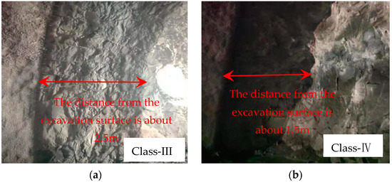 When the reserved core soil method is adopted for the construction of Class-IV surrounding rock, it is measured that the support structure is about 1.5 m away from the upper guide face, and it is observed that there are no obvious cracks and looseness in the surrounding rock. The results are in good agreement with the setting distance of the support structure obtained by the theoretical correction equation, which proves the rationality of the optimal support timing deduced by the theoretical equation. The distance between the on-site support structure and the tunnel face is shown in Figure 13.
