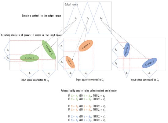 Clustering [] is a method of data mining by defining a data group (cluster) in consideration of the characteristics of the given data and finding representative points of the data group. GK clustering [] is a method of generating clusters considering the geometric attributes of data. However, it has the problem that only the data characteristics in the output space can be reflected because it only considers the data characteristics in the input space. Context-based GK clustering generates clusters by considering data characteristics in the output space. Figure 1 describes the concept of context-based GK clustering.