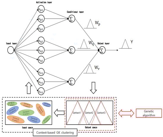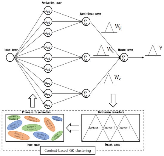 In Equation (7), are addition and multiplication signs that express the operations for IG. The fuzzy set is generated by processing the premise part of the CGK-based fuzzy granular model. The clusters generated by context-based GK clustering are expressed as an activation layer of the CGK-based fuzzy granular model. The part between the conditional and output layers is expressed as a linguistically descriptive context. The sum of final outputs of the CGK-based fuzzy granular model is expressed as follows using every context in the output space: