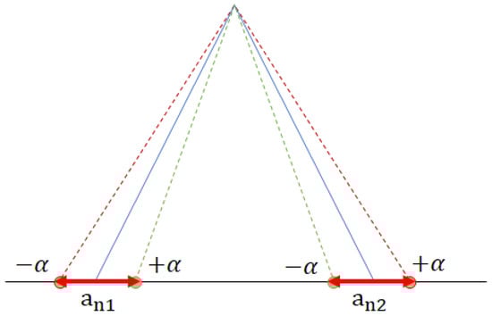 The general GM generated IGs through cluster centroid and showed a limitation that processed every IG similarly by assigning the same coverage value for every variable. In this study, the coverage of the IGs generated in the output space and the number of IGs in the input space are re-assigning to generate meaningful IGs, which improves GM’s prediction performance [,]. Figure 5 shows the process of generating rational IGs by re-assigning the variables of IGs generated in the output space. As shown in Figure 5, the information granule in the form of context has a lower bound and an upper bound. The middle vertex of the triangle is the model value. a1 is the lower bound of the model and a2 is the upper bound of the model. For a1 and a2, − and + are the ranges in which to optimize the lower and upper bounds to produce reasonable particles of information. Here, there are upper and lower limits. After random ranges are specified to the upper limits, the upper and lower limits that generate the satisfactory values for the coverage and specificity of IGs are searched using the optimization algorithm GA.