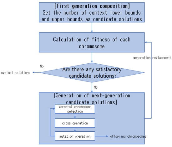 The CGK-based fuzzy granular model of the aggregated structure generates IGs of the context shape in the output space and IGs of geometric shape in the input space. In this study, the IGs of the context shape generated in the output space of the CGK-based fuzzy granular model of the aggregated structure is optimally assigned through the GA [,] based on biological genetics. GA sets the number of generations, cross-operation ratio, and mutation ratio and optimizes by creating a new group using genetic operators. It calculates the goodness of fit to confirm whether the new group has the optimal solution. The goodness of fit is evaluated using the PI obtained through training and validation data after the generation is created. The goodness of fit can quantitatively indicate how much the generated solution is fit for solving the problem. The sequence of GA is as follows. The initial chromosome is generated by using the upper and lower limits of the context to be optimized. The goodness of fit of each chromosome is calculated through the PI. The current chromosome becomes a parent chromosome, and from these, the offspring chromosome is generated through crossover and mutation operations. After calculating the goodness of fit of the generated child chromosomes, the above process is stopped if it is a satisfactory value; otherwise, the child chromosomes are generated again, and the above process is repeated. Figure 6 shows the flowchart of the genetic algorithm. The lower and upper limits of the context are set as candidate solutions, the fitness computation of each chromosome is calculated, and the result is repeated until satisfactory.