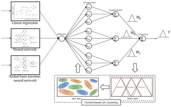 The CGK-based fuzzy granular model of the aggregated structure uses the input variables of the original data as input for the linear regression, artificial neural network, and radial basis function neural network. It uses the model’s output after the data are processed in each sub-model as input for the CGK-based fuzzy granular model, which is the upper model. Linear regression analyzes the correlation between input and output variables and is expressed as follows: