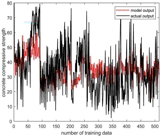 Table 5 summarizes the prediction performance of the optimized CGK-based fuzzy granular model that generated contexts uniformly. Table 6 summarizes the prediction performance of the optimized CGK-based fuzzy granular model of the aggregated structure that generated contexts uniformly. Table 7 shows how the contexts in the output space of the optimized CGK-based fuzzy granular model were optimized from the existing shape. Table 8 shows how the contexts in the output space of the optimized CGK-based fuzzy granular model of the aggregated structure were optimized from the current shape. Here, shows the upper limit of the first context and shows the lower limit of the second context. Because the upper and lower limits of each context were set to the optimal values, the PIs of 0.4781 and 0.5386 were higher than the prediction performance of the conventional CGK-based fuzzy granular model and the CGK-based fuzzy granular model of the aggregated structure. Figure 13 compares the output of the optimized CGK-based fuzzy granular model and the real output. Figure 14 shows the PI of the optimized CGK-based fuzzy granular model. Figure 15 compares the output of the optimized CGK-based fuzzy granular model of the aggregated structure and the real value. Figure 16 shows the PI of the aggregated structure’s optimized CGK-based fuzzy granular model. These figures show the prediction of the optimized fuzzy granular model was closer to the real output than that of the conventional fuzzy granular model.