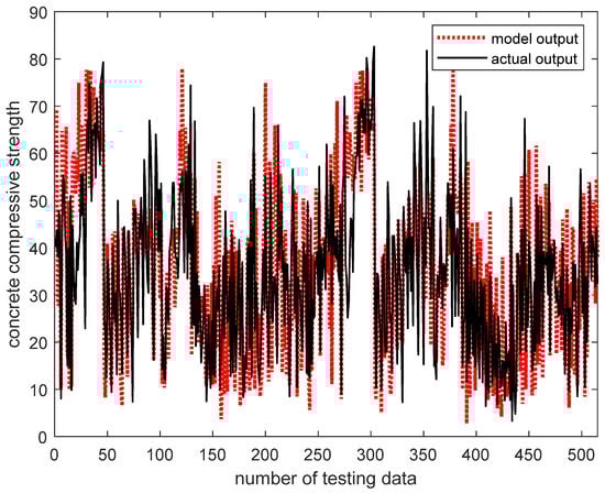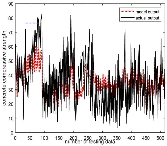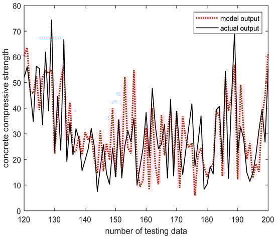 The following shows the result of the concrete compressive strength prediction experiment. Table 1 shows the prediction performance of the CGK-based fuzzy granular model that generated contexts uniformly. Table 2 shows the prediction performance of the CGK-based fuzzy granular model that generated contexts flexibly. Table 1 and Table 2 show that the higher the context, the higher the performance. The highest performance with a PI of 0.470 was achieved when the uniform generation method, six contexts, and four clusters were used. Figure 9 shows the output of the CGK-based fuzzy granular model and the real output. Figure 10 shows the PI of the CGK-based fuzzy granular model for the testing data. In Figure 9, the x-axis shows the number of concrete compressive strength, and the y-axis shows the concrete compressive strength. The solid black line indicates the real concrete compressive strength, whereas the red dotted line indicates the output of the CGK-based fuzzy granular model. In Figure 10, the x-axis shows the number of clusters generated in the input space, the y-axis shows the number of contexts generated in the output space, and the z-axis shows the PI for the validation data. Experiments were performed on the Windows 10 operating system, and the software used is MATLAB 2018a.