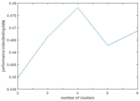 Table 3 and Table 4 summarize the prediction performance of the CGK-based fuzzy granular model of the aggregated structure. Table 3 shows the result of the method that uniformly generated contexts, whereas Table 4 shows the effect of using the method that flexibly generates contexts. Based on the result of this table, the method of generating contexts uniformly was used, and the highest performance with a PI of 0.5208 was achieved when the number of contexts was six, and the number of clusters was 4. Figure 11 shows the output of the CGK-based fuzzy granular model of the aggregated structure and the real output. Figure 12 shows the PI of the CGK-based fuzzy granular mode for validation data.