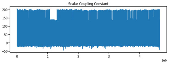 The molecular characteristics between atom pairs in molecules, the coupling type, and any other features to create the molecule structure were obtained from the Kaggle database [27]. As indicated in Table 1, the dataset contains both numerical and text data types. The id data type is an integer, whereas the molecule name data type is a combination of numbers and characters. The atom index 0 and atom index 1 columns are both integers, the coupling type columns are both numbers and characters, and the scalar coupling constant column is a float number. As indicated in Figure 1, the scalar coupling constant is the target variable.