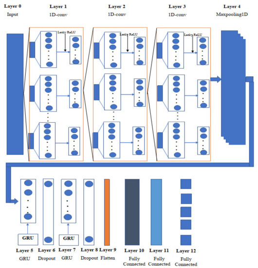 A gated recurrent unit (GRU) was implemented in the fifth layer with 128 neurons to overcome the vanishing gradient problem of 1D-CNN, and the activity regularizer of layer 2 was adjusted to 0.001, to penalize the layer output. Update and reset gates are the two gates used by GRU. These two gates determine which data are sent to the output. The network unit plugs in the update gate with input and multiplies it by its own weight . The same is true for , which stores data from earlier (t − 1) units and multiplies it by its own weight U(z). Both results were combined together, and the result was squashed using a Leaky ReLU activation function with an alpha of 0.001. The update gate assists the model in determining how much past data should be passed on to the future. The mathematical expression of the update gates is:
