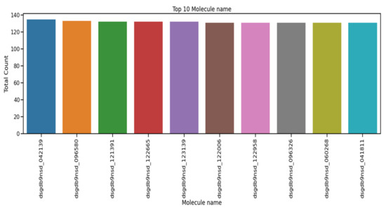 The performance of the recurrent neural network (RNN), long short term memory (LSTM), gated recurrent unit (GRU), one-dimensional convolutional neural network (1D-CNN), and the proposed 1D convolutional gated recurrent unit neural network (1D-CNN-GRU) molecular property systems is explained in this section. Table 3 shows the summary statistics for each of the columns of molecular properties. The mean, standard deviation, minimum, 25%, 50%, 75%, and maximum are analyzed. The mean of atom_index_1 is small compared to other molecular properties. Atom_index_1 also has a small volatility of 3.27 compared with other molecular properties, which indicating that the atom index fluctuates slowly and tends to be more stable, while Id has a maximum value according to Table. The minimum value of the molecular property dataset is within the range of 0 to −44. The coupling type consists of 3JHC, 2JHC, 1JHC, 3JHH, 2JHH, 3JHN, 2JHN, and 1JHN, as shown in the bar graph of Figure 3. 3JHC came in first position with the highest value of 1511207, followed by 2JHC with the value of 1140867, while 1JHN came last with the lowest value of 43680. The top 10 molecule names for molecular properties is shown in Figure 4. The molecule name that tops the list is dsgdb9nsd_042139, having the highest, followed by dsgdb9nsd_096580, dsgdb9nsd_121391, dsgdb9nsd_122665, and dsgdb9nsd_123139.