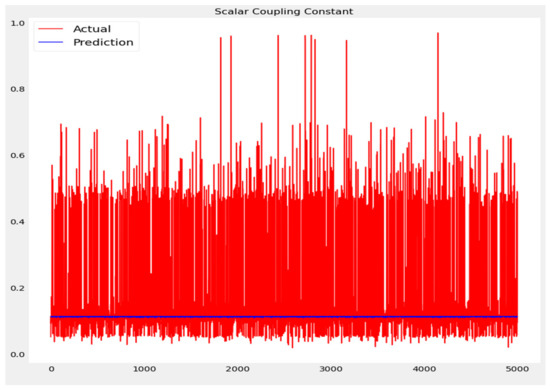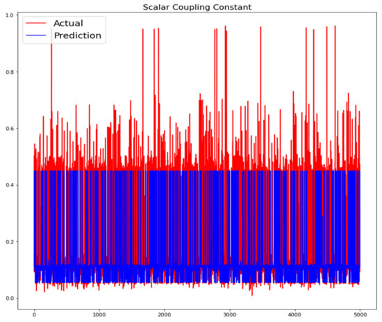The training loss and validation loss of deep learning algorithms considered in this study, such as RNN, LSTM, GRU, 1D-CNN, and the proposed method based on the 1D-CNN-GRU model when it was applied to the target variable of the scalar coupling constant are given in Figure 6, Figure 7, Figure 8, Figure 9 and Figure 10. It can be seen from Figure 10 that the proposed 1D-CNN-GRU training loss and validation loss decreased at the lowest speed. The training and validation loss values of the proposed model were obviously smaller than the values of the other deep learning models, thus obtaining better training and validation accuracies. However, although the training and testing performance of the standard 1DCNN was higher to that of the proposed model and combining them with GRU greatly improved the performance. The performance evaluation and errors of the different models, such as LSTM, RNN, GRU, 1D-CNN, and 1D-CNN-GRU, are presented in Table 4. It is noticeable from Table 4 that the metrics of MSE, RMSE, and MAE for the proposed 1D-CNN-GRU were relatively small. Due to the combination of 1D-CNN and GRU network parameter initialization, the output features of the proposed 1D-CNN-GRU model had a significant improvement over all other deep learning models. Figure 11, Figure 12, Figure 13, Figure 14 and Figure 15 is the prediction result of all the deep learning models considered in this study. Figure 15 shows that 1D-CNN-GRU can predict the scalar coupling constant better than the other deep learning models.