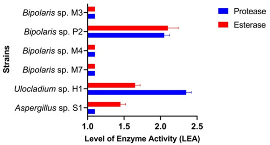 Esterase Activity. Investigation using Petri dishes revealed that all isolates had LEsA values between 1.0 (Bipolaris sp. M3, Bipolaris sp. M7, Bipolaris sp. M4) and 2.0 (Bipolaris sp. P2). Remarkable esterase activities were also harboured by Aspergillus sp. S1 and Ulocladium sp. H1 (Figure 3 and Figure S5).