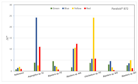 Calculated ΔE* values for all inoculated areas of the sample covered with Paraloid® B72.