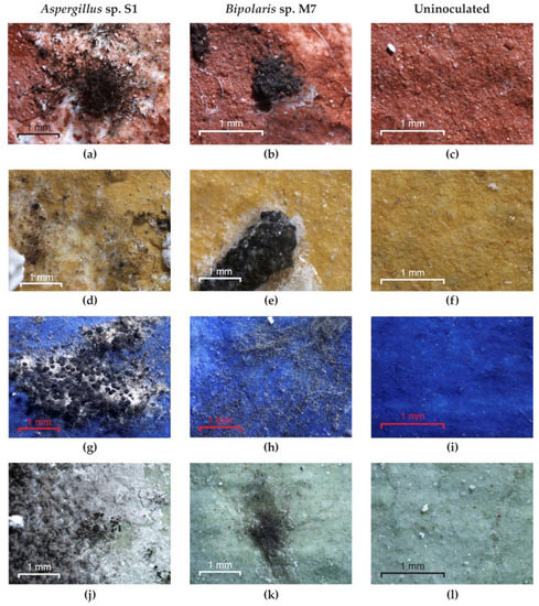Optical microscopy examination of the experimental models covered with Paraloid® B72 showed the following: germinated spores and an absence of mycelium for Aspergillus sp. S1 (Figure 8a) and Bipolaris sp. M4 strains on red pigment; germinated spores and an absence of mycelium for Aspergillus sp. S1 (Figure 8d) and Bipolaris sp. P2 strains on yellow pigment; poorly developed mycelium for Aspergillus sp. S1 on blue and green pigments (Figure 8g,j); well-developed mycelium in the case of Bipolaris sp. P2 and Bipolaris sp. M4 on blue and green pigments; well-developed mycelium in the case of the strains Ulocladium sp. H1, Bipolaris sp. M3 and Bipolaris sp. M7 (Figure 8b,e,h,k) on all pigments; and no growth on the uninoculated control (Figure 8c,f,i,l). After cleaning the experimental models, discoloured areas corresponding to the removal of spores or mycelium could be observed due to the fact that these fungi adhere firmly to the Paraloid® B72 layer through the ornamentation and the exopolysaccharide layer. In addition, in the cases of the yellow and green pigments, diffusion of melanin pigments in the substrate was observed (Figure S6).