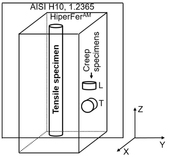 Schematic representation of electrical discharge machining of mechanical testing specimens from HiperFerAM LMD samples: creep specimens were taken from both the longitudinal and transversal directions, while tensile specimens were taken from the longitudinal direction only.