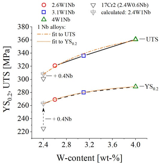 Impact of W and Nb in solid solution on ambient temperature tensile strength values with a virtual 2.4W1Nb alloy, equation: YS0.2 = a × (1 − cW − b); cW: W-content in wt.%, a: 300.05, b: 2.38; UTS = a × (1 − cW − b); cW: W-content in wt.%, a: 396.53, b: 1.71 [31].