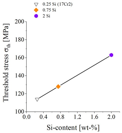 The addition of Si mainly resulted in a reduction in the Laves particle size, increased the number of particles and accelerated the precipitation kinetics [53]. From the evaluated increase in limit stress for dislocation creep σth by Si-alloying (Figure 4), it could be derived that by Si alloying, an approximate increase of 43% was obtainable.