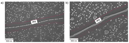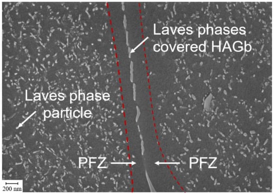 The typical microstructure of recrystallized and quality heat-treated ferritic, Laves-phase-strengthened steels consists of globular grains with particle-free zones (varying from 200–2000 nm in width, depending on the chemistry and temperature/stress history) along HAGbs (Figure 6). Near the PFZ (“IGExterior” region in Figure 6), the particles were usually slightly smaller. Gradual particle dissolution was argued to be the reason for this particular feature. The elements dissolving into the matrix diffuse toward the grain boundary and gradually coarsen the Laves phase particles located there. Accordingly, the particles in the grain interior (“IGcenter” region in Figure 6) were found to be larger [11].