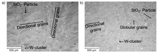 Large, aligned, rod-shaped grains were predominantly observed in the LPD-manufactured HiperFerAM, while only a small area of aligned, even smaller rod-shaped grains was encountered in the HPD variant (Figure 7) where the globular grain shape prevailed (Figure 7b). This demonstrated that the grain size could readily be adjusted by varying the AM processing parameters. Conventionally processed HiperFer 17Cr2 typically prevails in a grain size of approx. 500 µm, while both applied AM parameter sets resulted in predominantly globular grains in the size region of approx. 200 µm and less (Figure 8). However, incompletely melted tungsten clusters were observed (cf. Figure 7). An additional processing-related issue was SiO2 particles. These particles tended to be larger and more numerous in the LPD variant than in the HPD variant (cf. Figure 7). Finley-distributed SiO2 particles were also observed in LPBF-manufactured 316L [9].