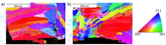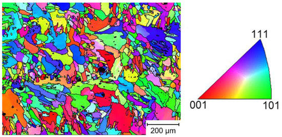 EBSD-IPF (inverse pole figure) micrograph of the LMD-manufactured HiperFerAM HPD variant in the as-built state (reproduced from [9]).