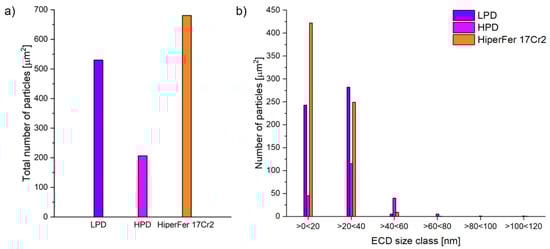(a) Area-specific total number of particles in the as-built LPD and HPD HiperFerAM and conventional HiperFer 17Cr2 Pa (2 h 650 °C) materials and (b) corresponding size classification by equivalent circle diameter (ECD).