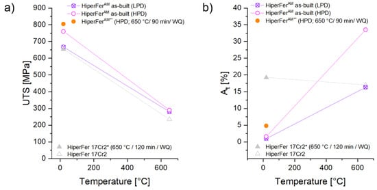 (a) UTS and (b) rupture elongation (At) of the 17Cr2 and HiperFerAM variants (LPD and HPD) at 20 °C and 650 °C. HT: * 650 °C/120 min, ** 650 °C/90 min.