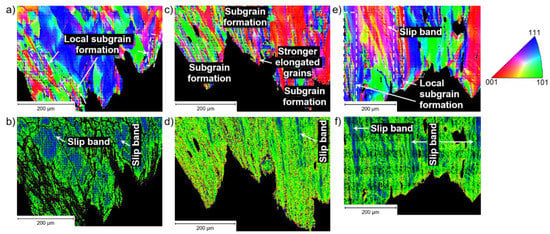 Effective grain refinement caused by the high degree of global sub-grain formation obviously yielded higher plastic deformability (Figure 13d) in the case of the HPD variant. From a comparison of Figure 13a,b (LPD), limited dislocation activity and/or plastic deformation in sub-grain free areas was evident, which indicates that deformation preferentially occurred due to sub-grain formation. This explained the significantly increased ductility of the specimens that were manufactured when applying HPD. In conventionally produced HiperFer 17Cr2 sheet material, local sub-grain formation occurred similarly to the LPD HiperFerAM (Figure 13a,e) variant, which explained the matching fracture elongations. Moreover, a stronger tendency toward slip band formation was observed in the conventionally produced HiperFer 17Cr2 (cf. Figure 13b,d–f).