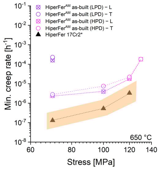 A 650 °C Norton plot of HiperFerAM with respect to the area-specific laser power and build direction in comparison to HiperFer 17Cr2* Data from [13].