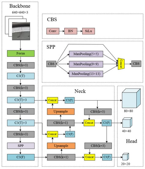 The architecture of YOLOv5s is shown in Figure 1, where k represents the convolution kernel size, C3(T) represents the C3 module containing a residual structure, C3(F) does not contain a residual structure, Upsample is the upsampling operation and CBS is the standard convolution process consisting of Conv (the convolution layer), BN (batch normalization) and SiLu (activation function).