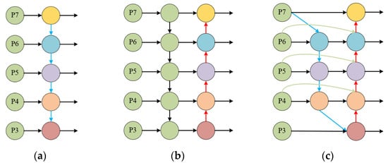 The BiFPN module is derived from the Google team’s 2019 EfficientDet network [27]. It strengthens higher-level feature fusion in the processing path, processing each bidirectional path (top-down and bottom-up) as a feature network layer, through the fusion of weighted features. The importance of different input features is learned, and differentiated fusion is carried out for different features [28]. Figure 3a,b show the FPN and PANet feature fusion structures used in the original YOLOv5 network. FPN carries out multi-scale feature fusion in a top-down manner, and PANet adds a bottom-up path on the basis of FPN. Figure 3c shows the BiFPN module, which is the feature fusion part of the EfficientDet network. It receives five effective feature layers P3–P7 from the backbone feature extraction network, carries out upsampling and downsampling feature fusion for these feature layers successively and sets weights for each node to balance features of different scales. In the figure, the blue route conveys high-level semantic information from the top down, while the red route conveys low-level location information from the bottom up.