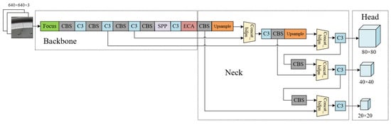 YOLOv5 is mainly composed of three parts: the backbone, neck and head. The backbone consists of a series of convolutional neural networks used to extract image features, mainly focus, C3 and SPP modules. The focus module slices the images and splices them into the channel dimension to integrate the width and height information into the channel dimension, which can effectively improve the speed of feature extraction. The C3 module is improved from the structure of the cross-stage partial (CSP) connections [23], having one less convolution layer and changing the activation function, and its main function is to extract features from images and reduce the repetition of gradient information. The spatial pyramid pooling (SPP) module respectively uses three pooling kernels of sizes 5, 9 and 13 to perform max-pooling operations on the images. This module can increase the receptive field of the network and obtain features of different scales. The neck is the feature fusion network of the model, where feature pyramid networks (FPNs) and path aggregation network (PANet) are adopted. The structure of the FPNs transmits semantic information from the top down, while the PANet additionally transmits location information from the bottom up on the basis of the FPNs. The head is the prediction network of the model and, through convolution operations, three groups of feature vectors containing the categories prediction boxes, confidence and coordinate position are output, which predict at scales of 80 × 80, 40 × 40 and 20 × 20, respectively.