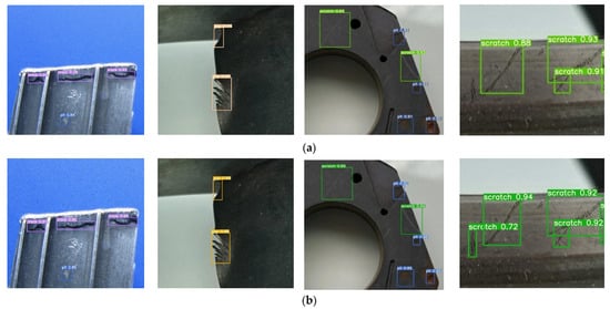 It can be seen from the comparison of the detection effects that the original YOLOv5s model had low confidence in crack and pit defect detection, and some scratch defects were missed or misdetected. Since the YOLOv5s-KEB model introduced an ECA attention mechanism, it focused on defect areas in the feature extraction process and enhanced the expression of defect features, so it improved the detection of scratch defects that were missing or misdetected by the former model. At the same time, the BiFPN module was used to improve the feature fusion aspect and fully integrate the features of different scales, thus improving the detection accuracy for crack and pit defects.