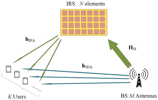 where denote the phase shift matrix at the RIS and is the phase shift of the i-th reflecting element; deontes the user’s additional distortion noise, which satisfies the Gaussian distribution with zero mean and denotes the normalized variance of the received distortion noise; denotes the additive Gaussian white noise by the k-th user.