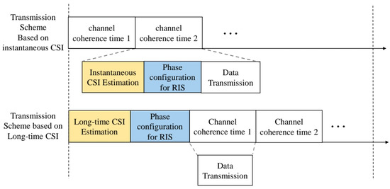 For the existing transmission schemes for RIS-assisted communication systems, the instantaneous CSI is adopted to adjust the beamforming and RIS phases shift, which requires channel estimation in each channel coherence time interval, as shown in Figure 2. However, this method has some drawbacks, as summarized as follows. For the instantaneous CSI-based scheme, the beamforming matrix and phase shift matrix need to be calculated in channel coherence interval, which increases the computational complexity. Furthermore, phase shifts of the RIS need to be updated frequently and sent back to the RIS controller, which incurs significant feedback overhead.
