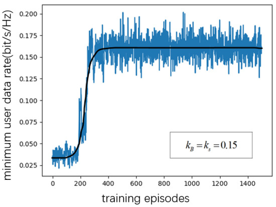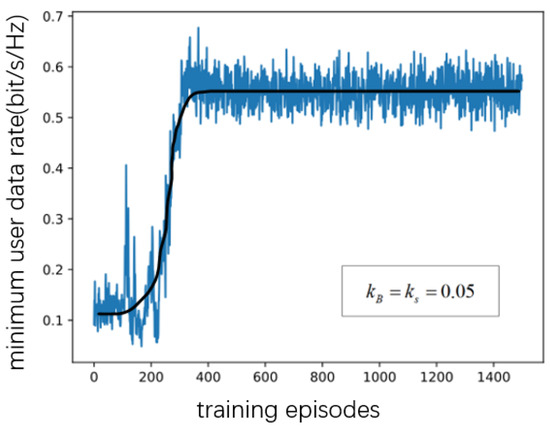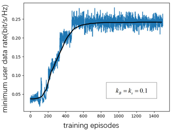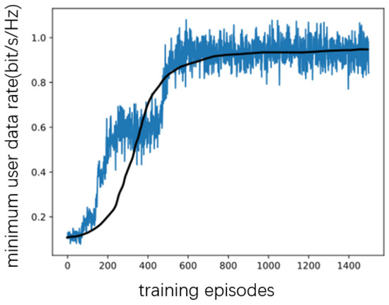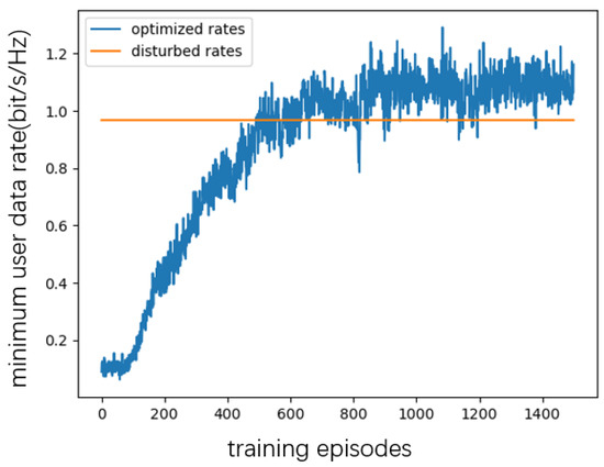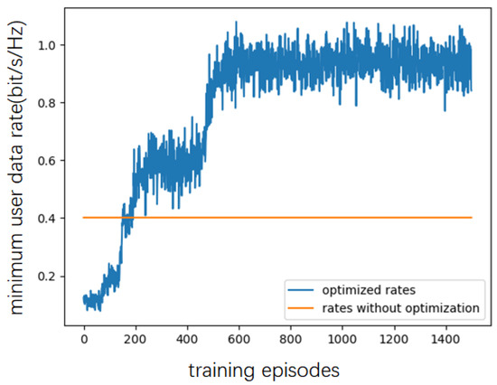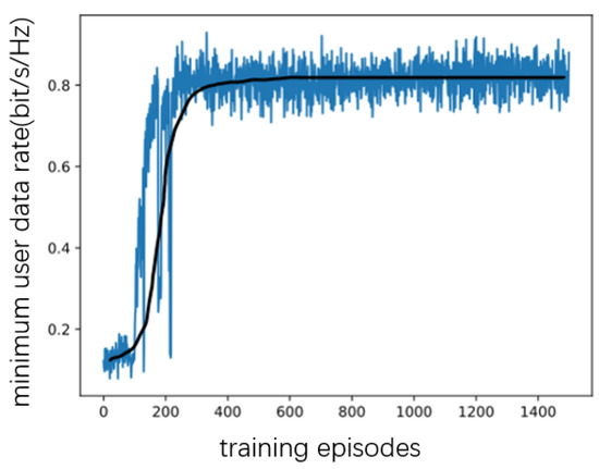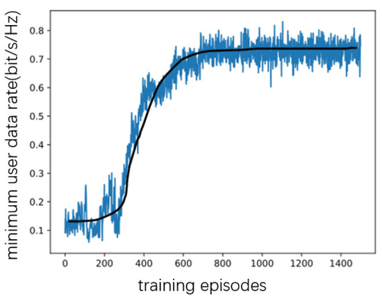 As shown in Figure 3, Figure 4, Figure 5 and Figure 6, when the number of RIS reflecting elements is set to , the MAUR (minimum average user date) converges to when the number is set to , MAUR converges to about . When the number of RIS reflecting elements increases to 40, MAUR increases to , and when N is 50, the rate is about . Hence, the MAUR increases with the number of reflecting elements. Meanwhile, the simulation results show that, under different conditions, the increase in the number of reflecting elements does not affect the converging speed of the proposed DDPG algorithm.