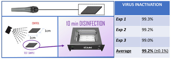 Regarding foam disinfection, to determine the UV-C disinfection efficacy, samples of foam of 1 cm2 were used. The samples were contaminated via a spraying device to mimic aerosol formation and deposition. The spraying device was placed at a distance and angle that allowed us to cover two foam samples with aerosols simultaneously during a short burst. One sample served as control and the other sample was treated with UV-C (Figure 3). For the spraying deposition, it was found that more liquid was deposited than in the initial recovery experiments, where 10 µL aliquots of M13 suspension were applied to the foam by pipetting. Therefore, the M13 concentration used for the contamination of foams by spraying was reduced to 1011 PFU/mL. The exact volume could not be determined, but, the extractability and comparison between the control and sample remain correct.