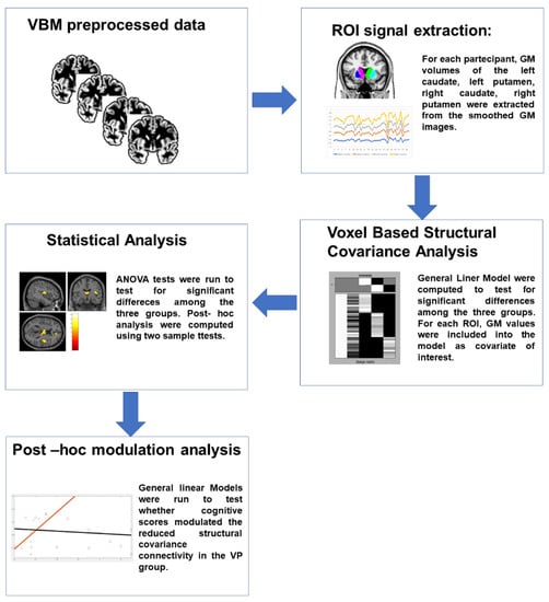 Workflow of the analyses. Subject-specific T1-weighted images were preprocessed using CAT12 toolbox and gray matter (GM) maps were generated. GM values of specific ROIs were extracted and entered as covariate of interest in separate GLMs to test for differences in the structural covariance connectivity among the three groups. T-contrasts were then used to compare each couple of groups. Finally, to test whether the reduced structural covariance connectivity in the VP group was explained by the lower scores in cognitive domains, a post hoc modulation analysis was run. GM: gray matter; VP: vascular parkinsonism; GLM: general linear model.