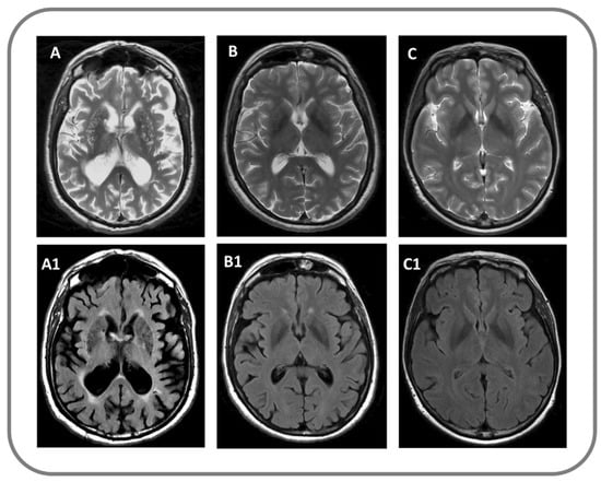 Findings on conventional structural MRI in a patient with VP (A,A1), with PD (B,B1) and in a control subject (C,C1); (A–C) panels: T2-weighted image; (A1–C1) panels: Fluid attenuated inversion recovery (FLAIR) image.