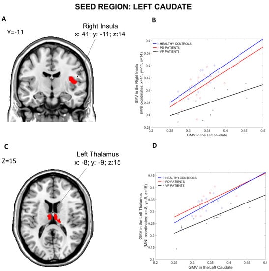 The results of the structural covariance analysis from the Left Caudate (seed region) are reported in Table 2. Comparing the three groups (Figure 3), differences in structural associations between the Left Caudate and the rest of the brain were found in the Left Thalamus (x: −8, y = −9, z: 15, p = 0.001 fwe cluster-level corrected) and in the Right Insula (x: 41, y = −11, z: 14, p = 0.027 fwe cluster-level corrected). Post hoc comparisons revealed that the difference in the Left Thalamus was driven by reduced connectivity in the VP group compared to the PD group (x: −8, y = −9, z: 15, p = 0.034 fwe cluster-level corrected). Moreover, VP patients showed reduced connectivity between the Left Caudate and the Left Hippocampus (x: −15, y = −36, z: 3, p = 0.02 fwe cluster-level corrected) compared to PD patients. Furthermore, when compared to HCs, VP patients displayed a reduced structural association between the Left Caudate and the Right Insula (x: 41, y = −11, z: 14, p < 0.001 fwe cluster-level corrected), the Right Thalamus (x: 23, y = −30, z: −3, p = 0.026 fwe cluster-level corrected) and the right Anterior Cingulate Cortex (x: 9, y = 45, z: 8, p = 0.004 fwe cluster-level corrected). Nothing was found in the other post hoc comparisons (HCs more than PD, HCs less than PD, VP more than HCs, and VP more than PD).