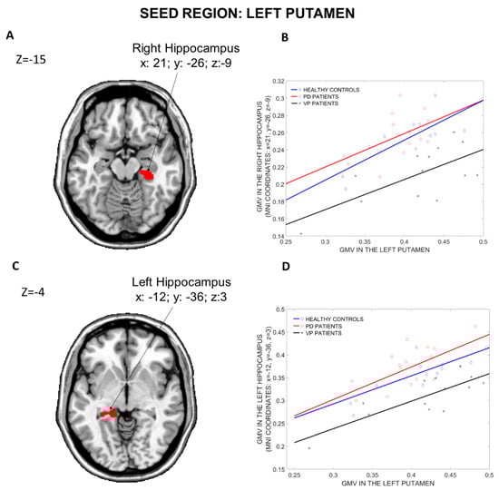 The results of the structural covariance analysis from the Left Putamen (seed region) are reported in Table 3. Comparing the three groups (Figure 4), differences in structural associations between the Left Putamen and the rest of the brain were found in the Right Hippocampus (x: 21, y = −26, z: −9, p = 0.001 fwe cluster-level corrected) and in the Left Hippocampus (x: −12, y = −36, z: 3, p = 0.049 fwe cluster-level corrected). Compared to PD patients, VP patients showed fewer structural associations between the Left Putamen and the Left and Right Hippocampus (x: −12, y = −36, z: 3, p = 0.028 fwe cluster-level corrected, and x: 21, y = −26, z: −9, p = 0.05 fwe whole-brain corrected, respectively). Furthermore, when compared to HCs, VP patients displayed a reduced structural association between the Left Putamen and the Right Hippocampus (x: 27, y = −11, z: −11, p = 0.02 fwe whole-brain corrected), the Right Insula (x: 41, y = −11, z: 14, p < 0.001 fwe cluster-level corrected), the Left Rectus (x: −9, y = 23, z: −14, p = 0.016 fwe cluster-level corrected) and the Right Cerebellum Crus 2 (x: 17, y = −78, z: −36, p = 0.019 fwe cluster-level corrected). Nothing was found in the other post hoc comparisons (HCs more than PD, HCs less than PD, VP more than HCs and VP more than PD).