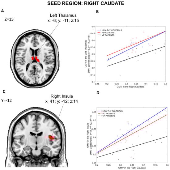 Group differences in the structural covariance of the Right Caudate. Brain maps are displayed using the neurological view. Panel (A): Voxels of the Left Thalamus that expressed differences in the structural association across the three groups. Panel (B): Correlations between the mean gray matter volume of the Right Caudate and the regional gray matter volume extracted from a 4 mm-radius sphere centered on the peak voxels of the significant cluster (x: −6, y= −11, z: 15). Panel (C): Voxels of the Right Insula that expressed differences in the structural association across the three groups. Panel (D): Correlations between the mean gray matter volume of the Right Caudate and the regional gray matter volume extracted from a 4 mm-radius sphere centered on the peak voxels of the significant cluster (x: 41, y= −12, z: 14). Blue diamonds represent HCs, red circles represent PD patients and black crosses represent VP patients. GMV: gray matter volume; HCs: healthy controls; PD: Parkinson disease; VP: vascular parkinsonism.