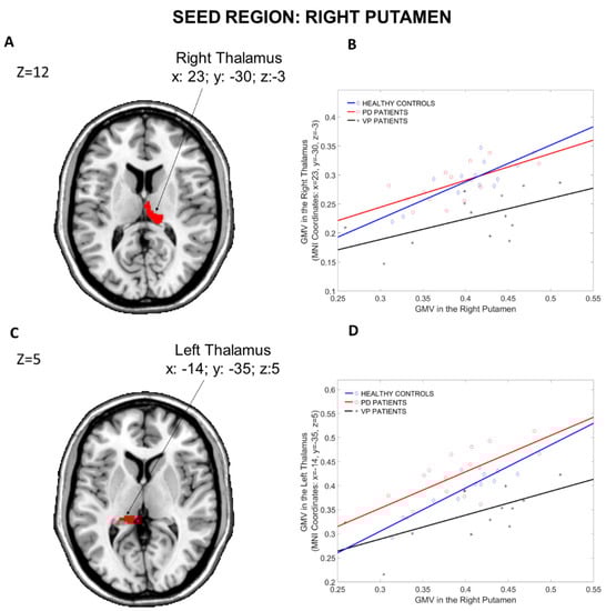 Group differences in the structural covariance of the Right Putamen. Brain maps are displayed using the neurological view. Panel (A): Voxels of the Right Thalamus that expressed differences in the structural association across the three groups. Panel (B): Correlations between the mean gray matter volume of the Right Putamen and the regional gray matter volume extracted from a 4 mm-radius sphere centered on the peak voxels of the significant cluster (x: 23, y = −30, z: −3). Panel (C): Voxels of the Left Thalamus that expressed differences in the structural association across the three groups. Panel (D): Correlations between the mean gray matter volume of the Right Putamen and the regional gray matter volume extracted from a 4 mm-radius sphere centered on the peak voxels of the significant cluster (x: −14, y = −35, z: 5). Blue diamonds represent HCs, red circles represent PD patients and black crosses represent VP patients. GMV: gray matter volume; HCs: healthy controls; PD: Parkinson’s disease; VP: vascular parkinsonism.