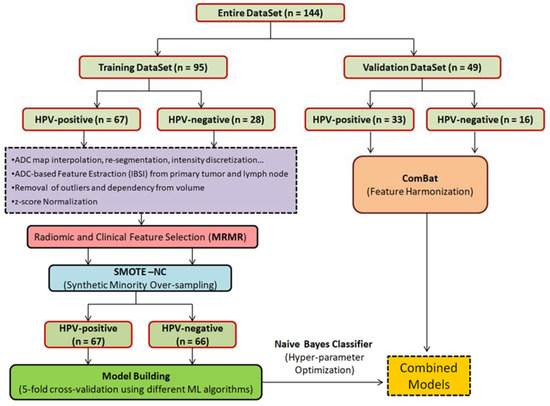 The following are available online at https://www.mdpi.com/article/10.3390/app12147244/s1, Table S1: List of radiomic features derived from ADC and D maps, Table S2: Details about image pre-processing before feature extraction, Table S3: Values of the most significant features for differentiating HPV-negative from HPV-positive patients, based on the Mann–Whitney test, Table S4: Comparison between the models in the validation set by the mid-p-value McNemar test, Figure S1: The effect of the ComBat-based feature harmonization on the validation set, Figure S2: Comparison between accuracies obtained from different families of machine learning algorithms.