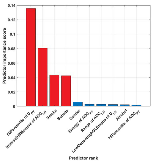 The results of feature selection on the training set are illustrated in Figure 2, which shows the ranks of the top ten predictors. Four features were dominant over all the others: the 50th percentile of DPT (i.e., the median value), the inverse difference moment of ADCLN (which is a measure of homogeneity from the GLCM family), smoking habits, and tumor subsite (tonsil versus base of the tongue).