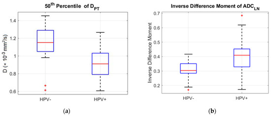 Box-and-whisker plots of the 50th percentile of DPT and Inverse Difference Moment of ADCLN, sorted by HPV status, are illustrated in Figure 3; the median (inter-quartile range) of the 50th percentile of DPT was 1.15 × 10−3 mm2/s (0.25) and 0.91 × 10−3 mm2/s (0.24) for HPV-negative and HPV-positive patients, respectively (p < 0.001, Mann–Whitney test); analogously, the median (inter-quartile range) of Inverse Difference Moment of ADCLN was 0.30 (0.07) and 0.41 (0.12) for HPV-negative and HPV-positive patients, respectively (p < 0.001).
