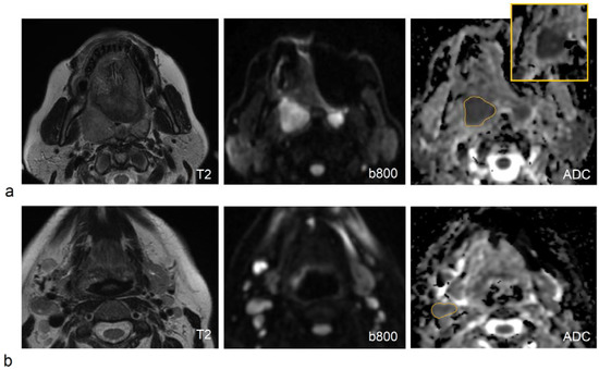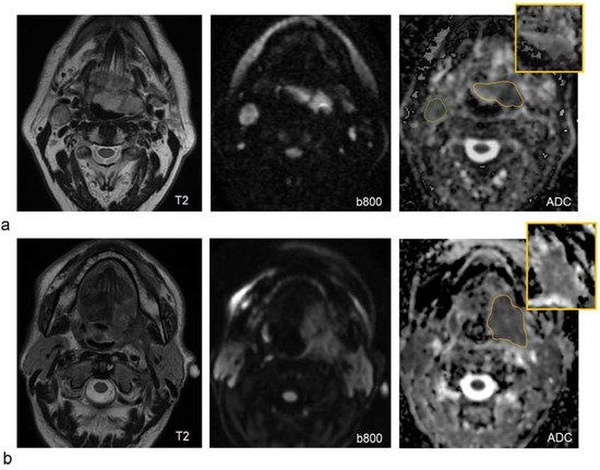 - Driessen, J.P.; van Bemmel, A.J.; van Kempen, P.M.; Janssen, L.M.; Terhaard, C.H.; Pameijer, F.A.; Willems, S.M.; Stegeman, I.; Grolman, W.; Philippens, M.E. Correlation of human papillomavirus status with apparent diffusion coefficient of diffusion-weighted MRI in head and neck squamous cell carcinomas. Head Neck. 2016, 38 (Suppl. 1), E613–E618. [Google Scholar] [CrossRef]