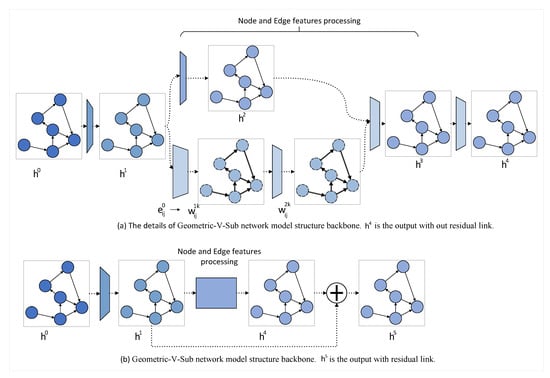 In geometry, the edge between vertex A and vertex B can be represented by AB. This vector contains the connection between two nodes. Vertex B can be derived from vertex A through this vector, and vice versa; based on this principle, Geometric-V-Sub can obtain the relationship between nodes in the top data. The network model takes node features as coordinates, where represents the layer in the structure, and the AB vector of the difference between Na node features and Nb node features as edge features, as shown in the Equation (9):