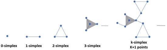 Simplicial complexes are essential in the extraction of topological features from point cloud data. A single data point may define 0-Simplex. A line between two points denotes 1-Simplex. A triangle is a 2-Simplex. Tetrahedra represent 3-simplices (see Figure 1). Finally, a combination of simplices gives way to a Simplicial Complex called Vietoris Rips Complex [30,31,32].