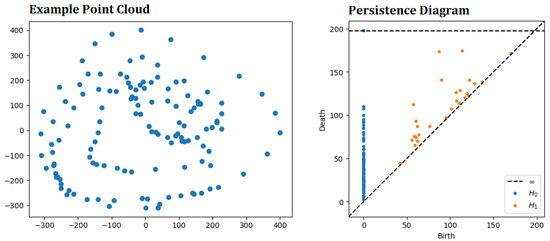 The Persistence Diagram representation (PDR) is a standard way to represent PH [33,34]. K-dimensional features consist of persistence diagrams; 0-dimensional features represent components that are connected, 1-dimensional features represent holes, 2-dimensional features voids, etc. [35]. Concurrently, a PDR is made of n features, , with . Each point corresponds to the lifespan of one topological feature, where and are its birth time and death time, respectively (birth time indicates when the geometrical structure appears, while death time indicates when the geometrical structure disappears). Points are entirely located in the half-plane above the diagonal [36] (Figure 3).